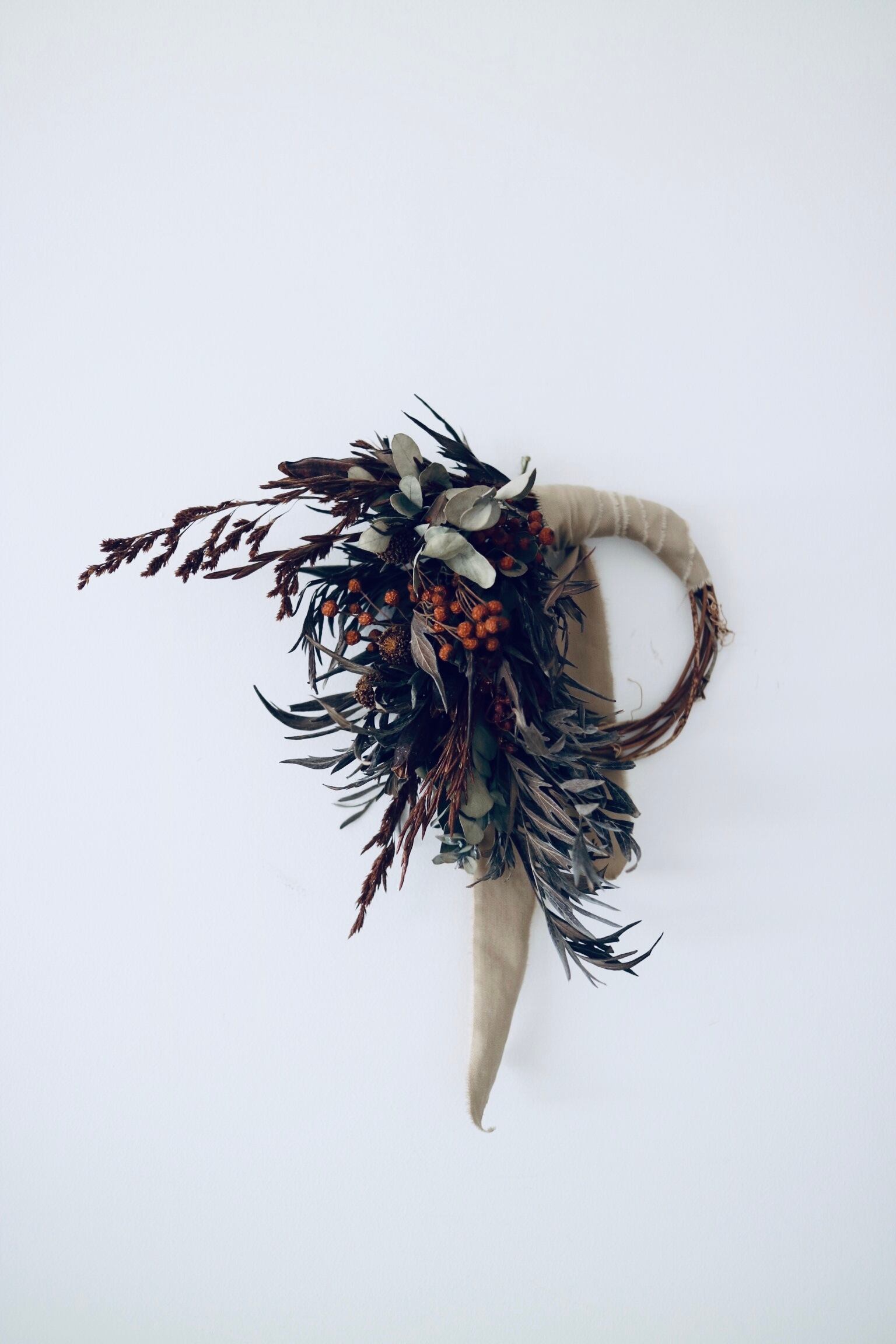 ・縦20cm x 横25cm(1枚目の写真の方向) ・色付き始める秋色のリース ・壁掛け用にワイヤーを付けていますが、どの角度でもお好きな向きで壁にかけてお楽しみください。 ・ベージュのリボン付き ・全てドライの花材です。接触で実や葉が落ちたりすることがあります。ご了承下さい。 ・箱に入れて郵送いたしますので、贈り物としても。