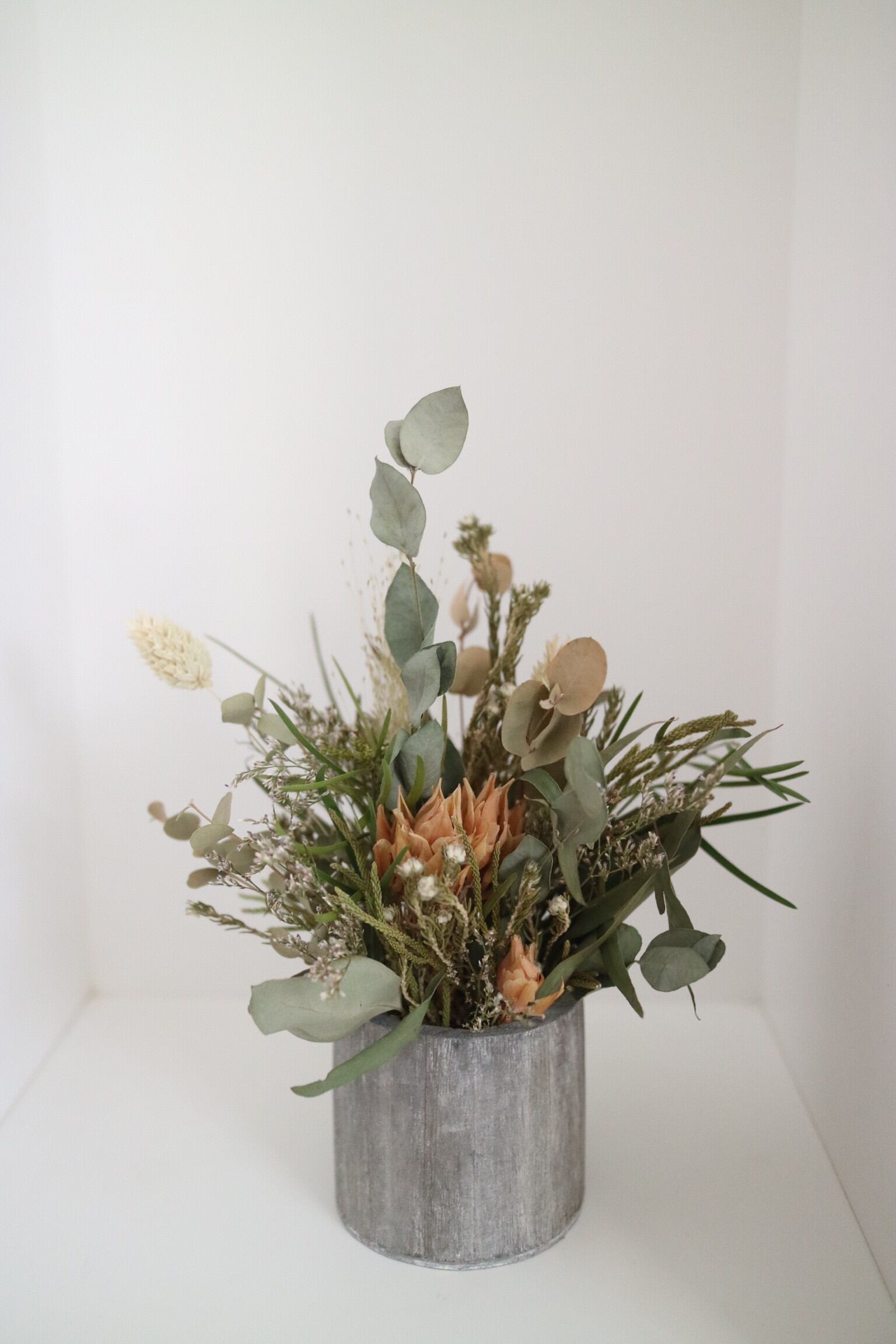 ・インテリアに馴染む置き型のドライフラワーです。 ・高さ約20cm x 横約15cm ・セルリア、フロリバンダ、ユーカリ、ブルーファンタジア、etc... ・セルリアのドライとユーカリなどで草原のイメージで。