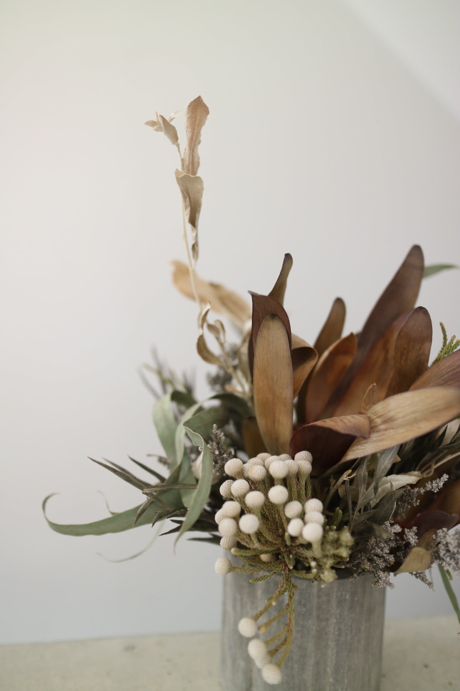 ・インテリアに馴染む置き型のドライフラワーです。 ・高さ約20cm x 横約15cm ・グレビレア、ストーブプラモーサ、ブルニア、リューカレンドロン、etc... ・シックな大人っぽいイメージ