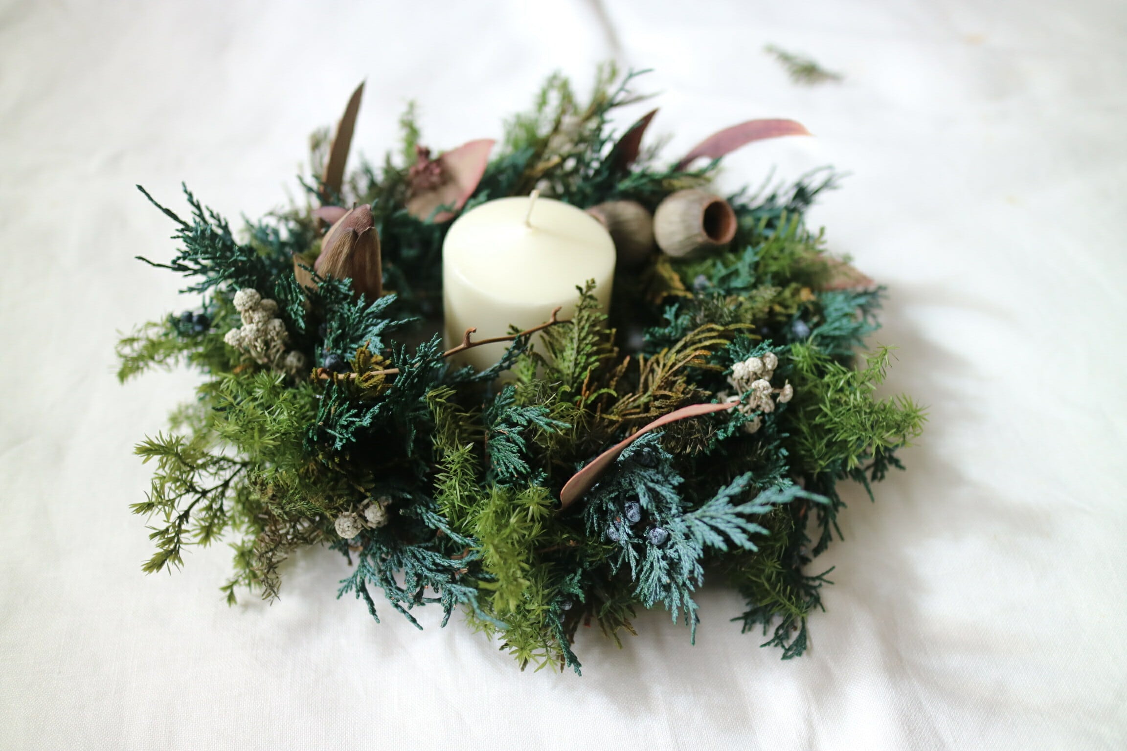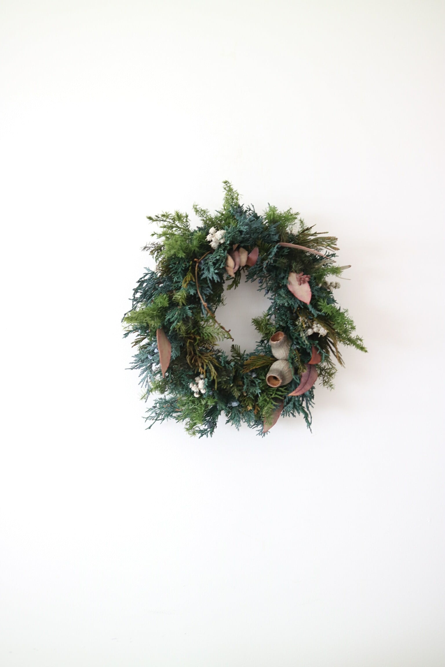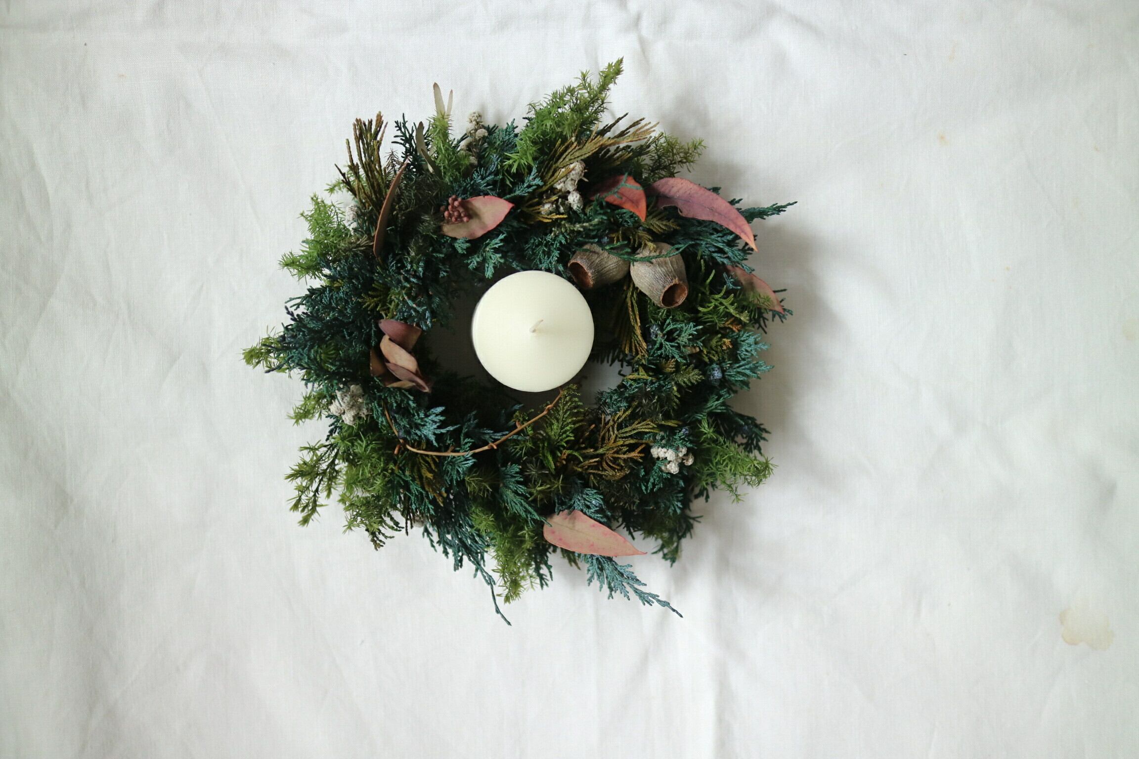 ・ヒムロスギ、シダー、コットンブッシュ、ユーカリ、ベルガムナッツ... ・プリザーブド素材のグリーンを多く使って、長い期間楽しんでいただけるリースをご注文いただきました。テーブルなどの上で置いても楽しんでいただけます。