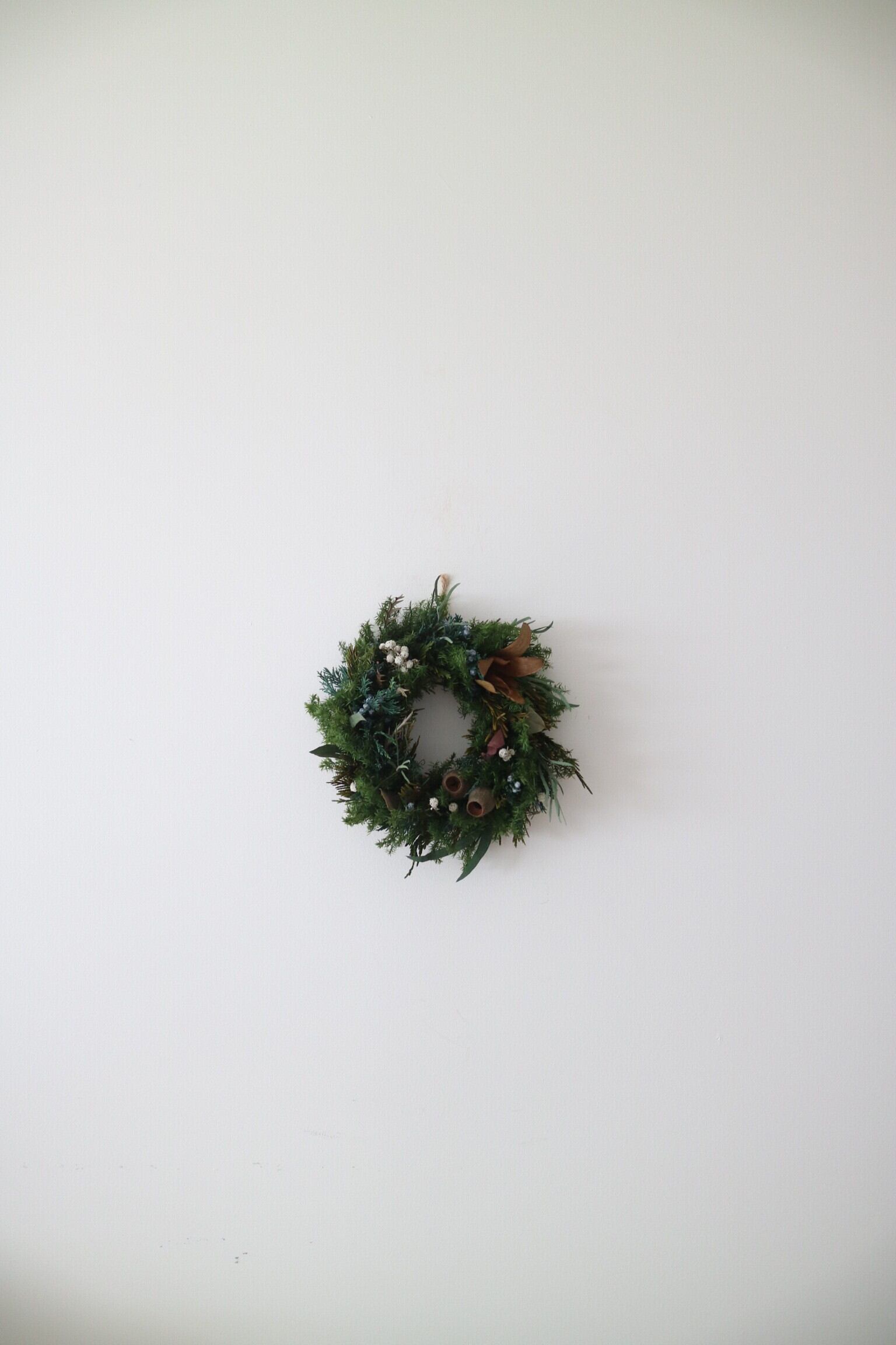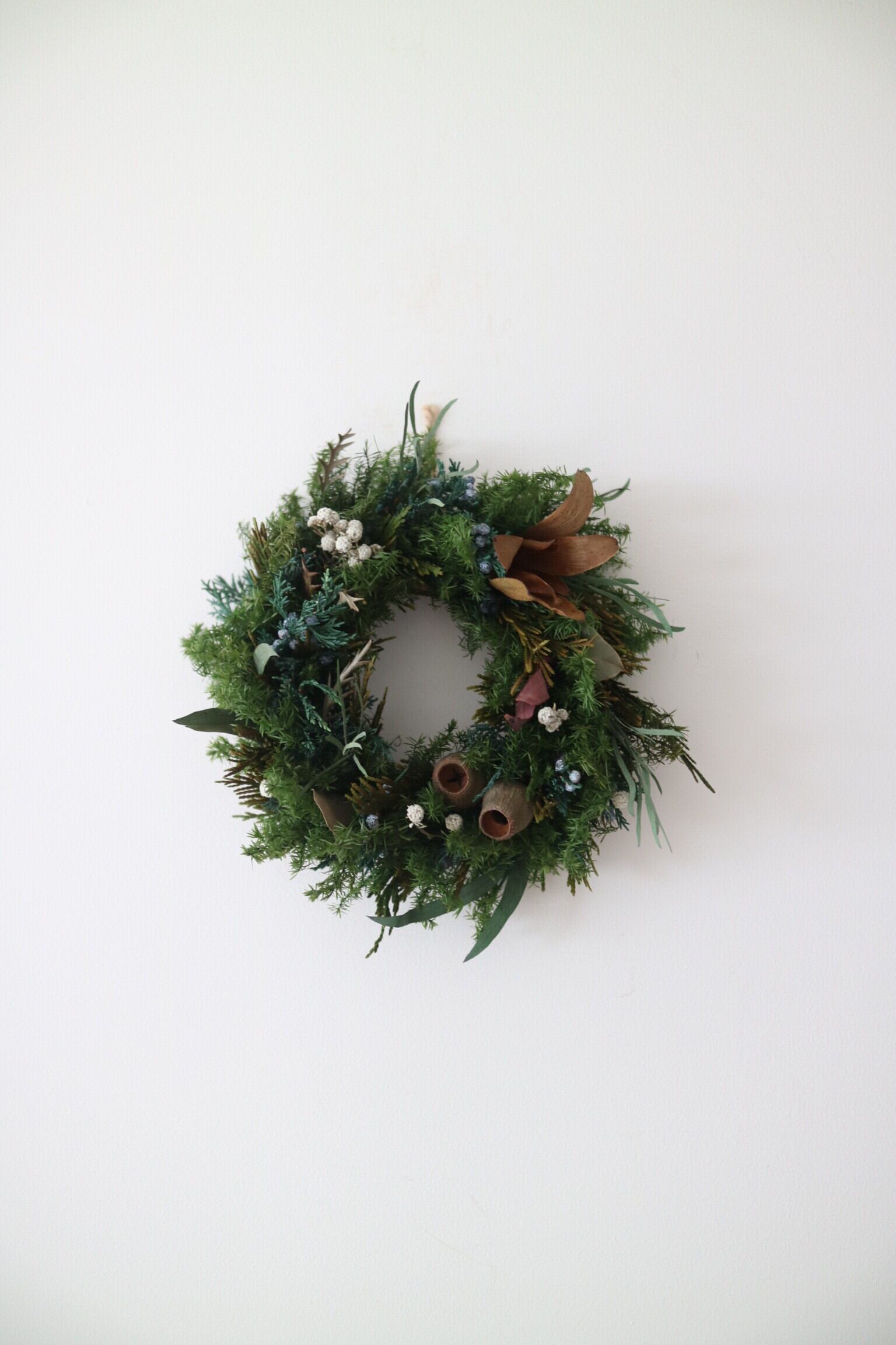 ヒムロスギ、シダー、マウンテンジュニパー、コットンブッシュ、ユーカリ、ベルガムナッツ... プリザーブド素材のグリーンを多く使って、長い期間楽しんでいただけるリースをお友達用にもご注文していただきました。テーブルなどの上で置いても楽しんでいただけます。