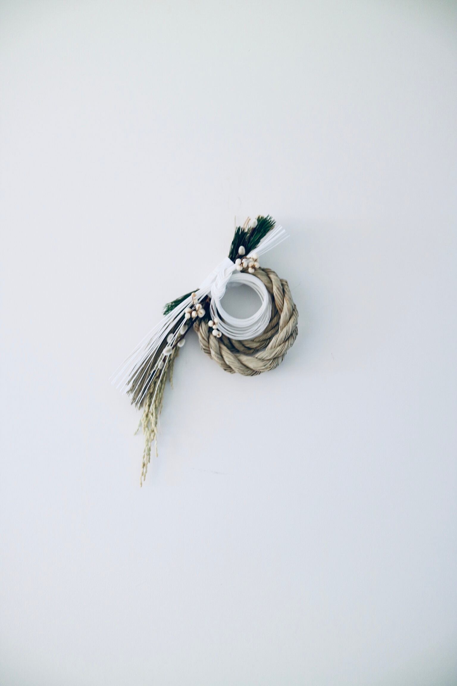 ・約30cmx15cm ・シンプルで清々しいしめ縄に仕上げました。 ・松はプリザーブド、ナンキンハゼ、猫柳はドライなので長い期間変化しにくいものになっています。
