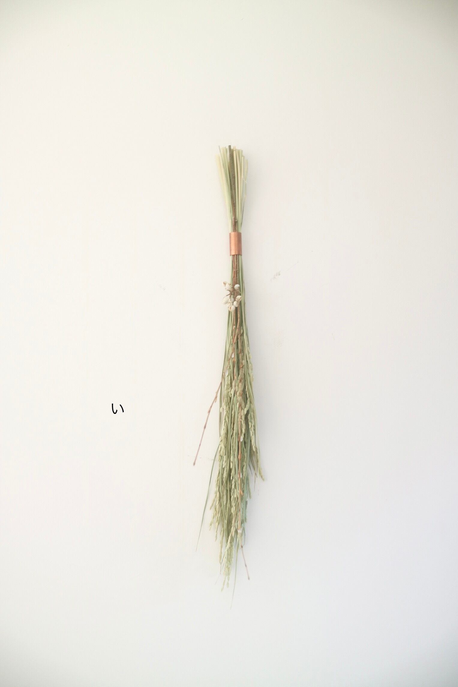 ・縦 約60cm ・稲穂、水引、南京ハゼ、柳、プリザーブド松などを使用して縦に長いお飾り ・あ、い、う、お、銅や真鍮を使用