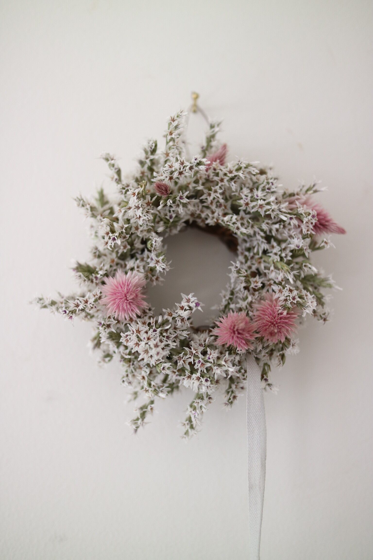 ・タタリカとシャロンケイトウのスモールリースです ・直径11cm ・グレーのコットンリボン付き ・すべてドライの素材です