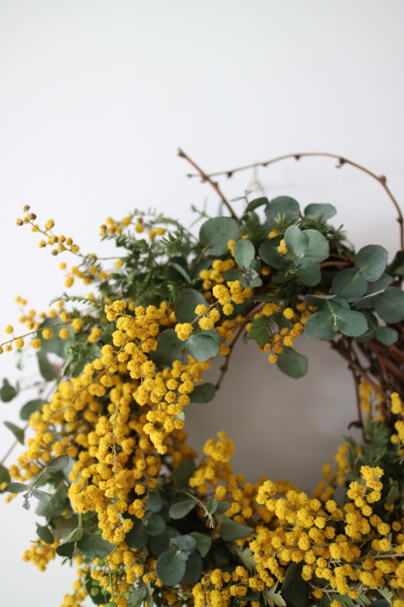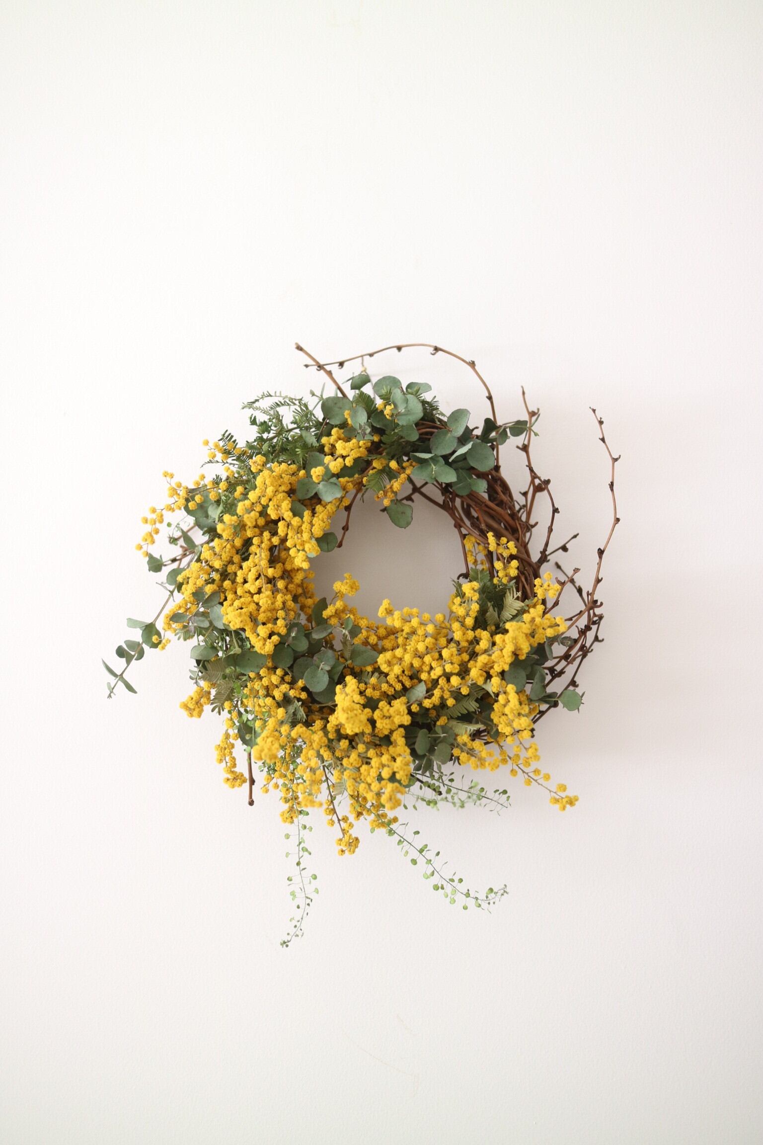 ・ミモザ、ユーカリ、ナズナのリース ・直径23cm〜25cm ・ドライになっていきますので、特にミモザは触れるとポロポロと落ちる場合がございます。取扱にご注意下さい。