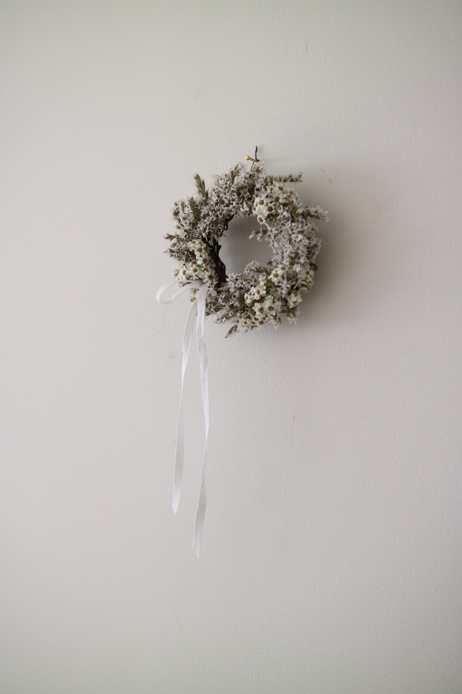・ミニデイジーとタタリカの白いかわいいミニリースです。 ・直径10cm ・ホワイトコットンリボン付 ・すでにドライになっています。