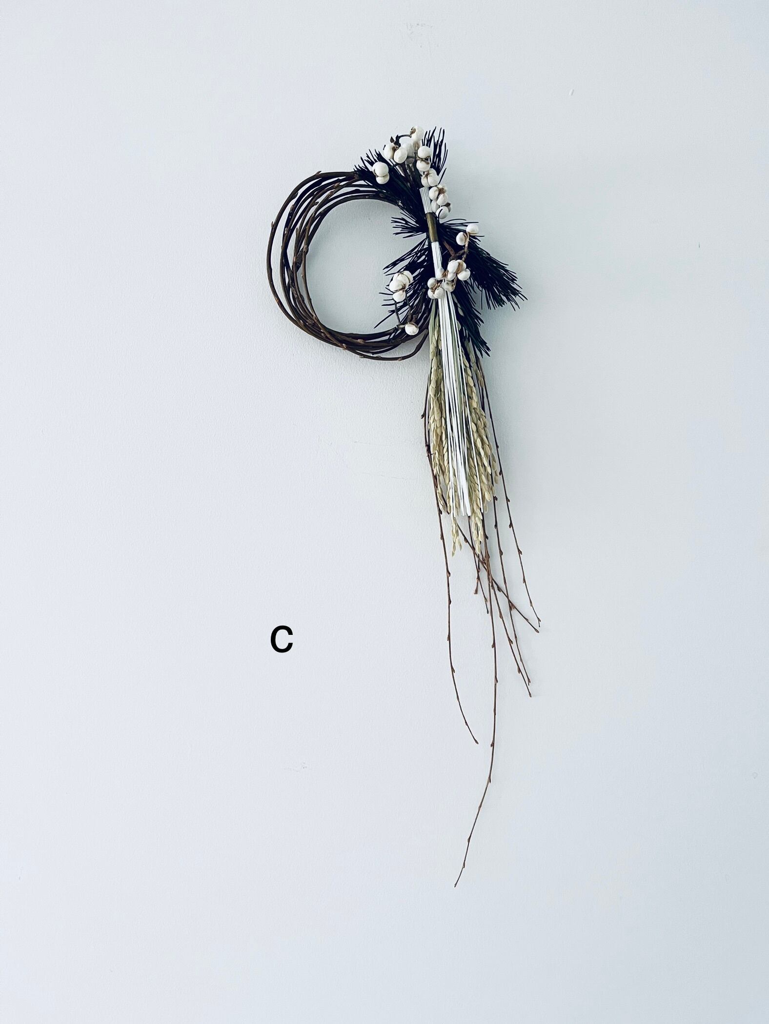 ・縦約35cm 横約15cm ・柳をくるっと巻いたものに稲穂、松、ナンキンハゼ、水引、ヒカゲノカズラで賑々しく