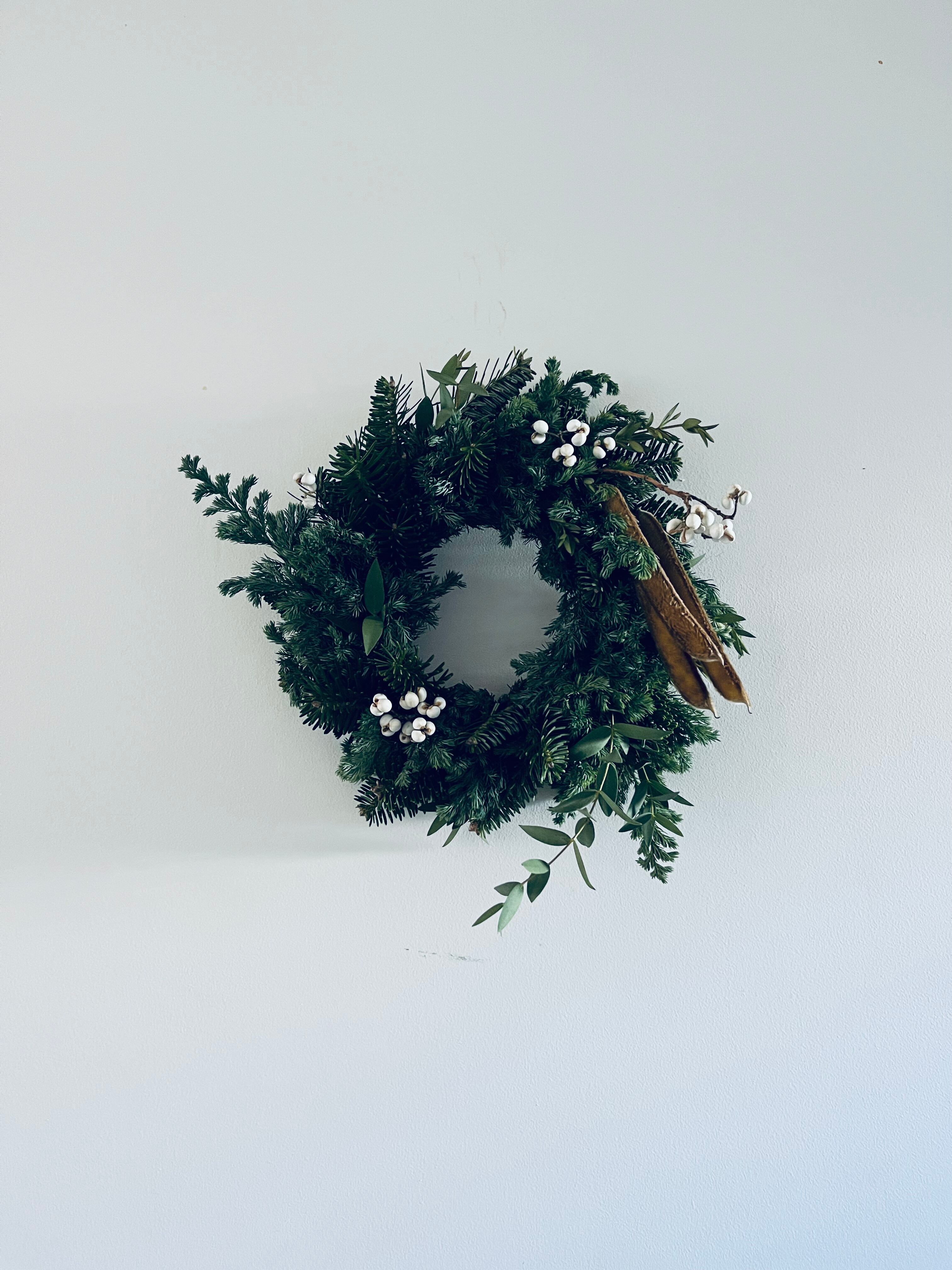 ・直径 約27cm ・フレッシュなウラジロモミ、ブルーバード、パルビフォリアやナンキンハゼで新雪が積もった森のイメージで ・クリスマスまでドライになっていく過程を楽しんで頂けます