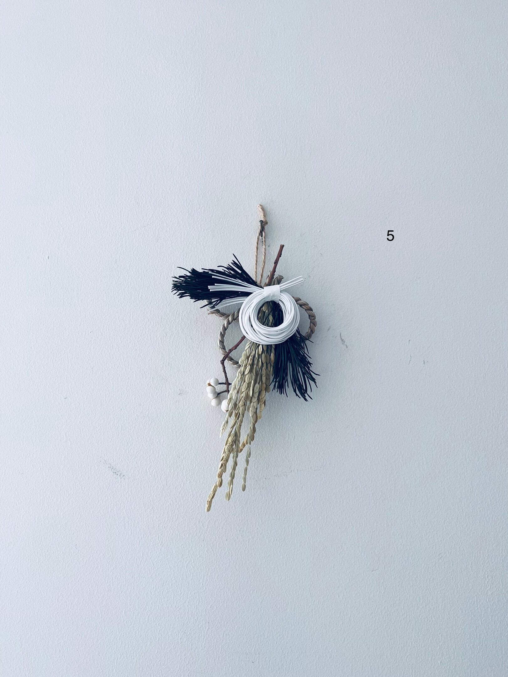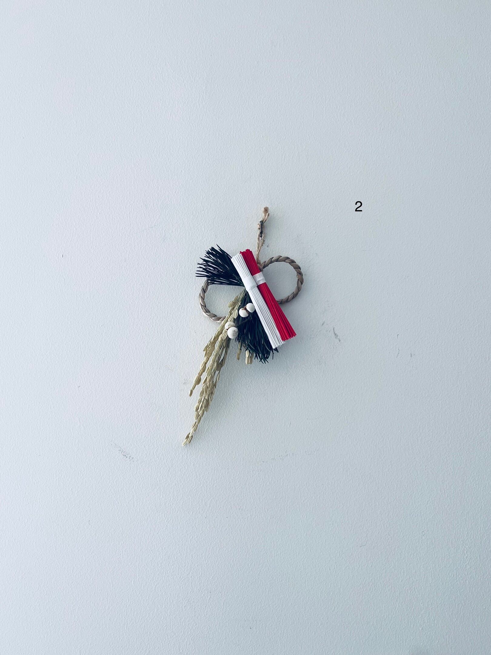 縦約15cmx横約10cm 小さい3つの輪に水引、稲穂、松やヒバ、ナンキンハゼで賑々しく