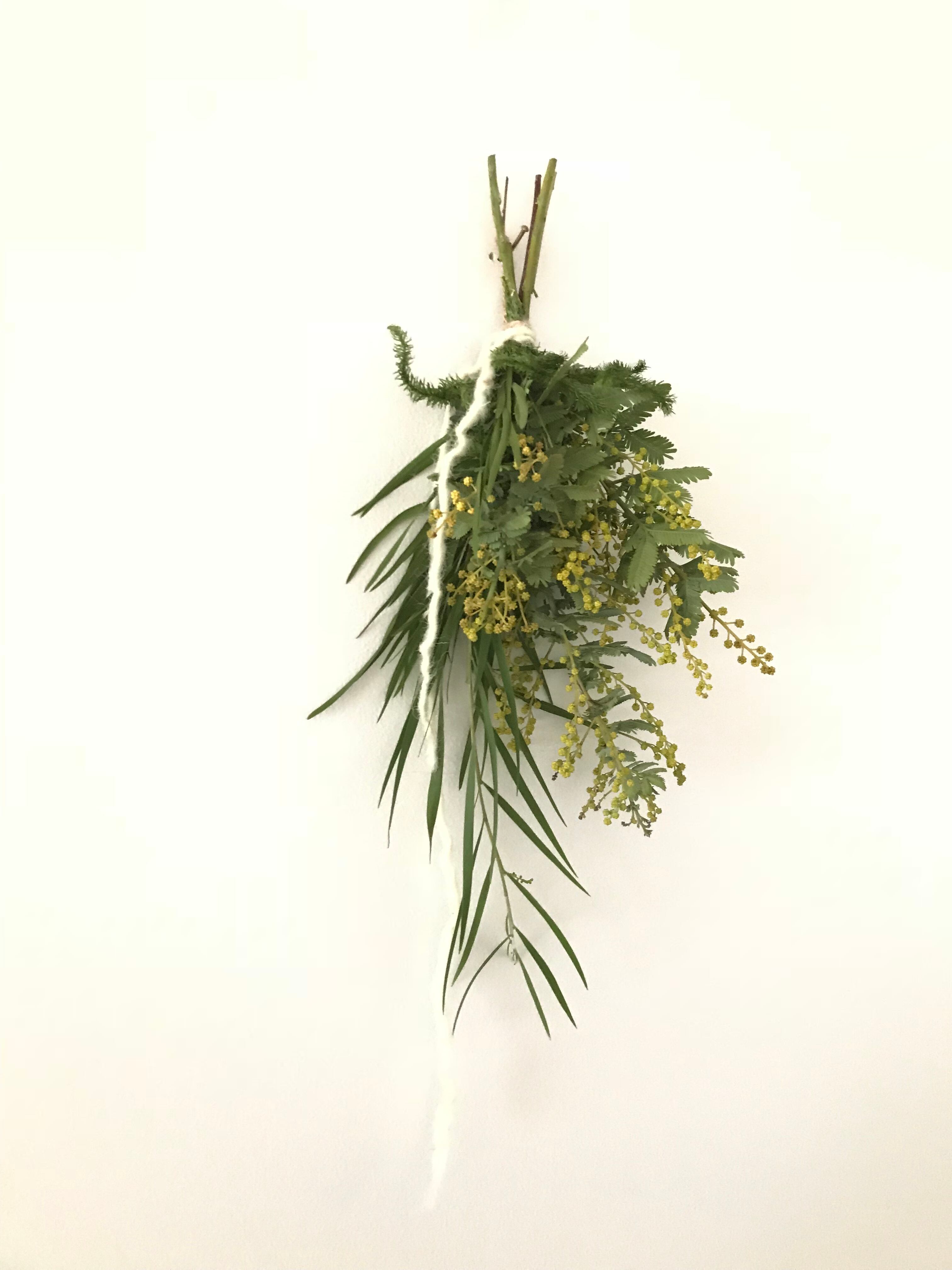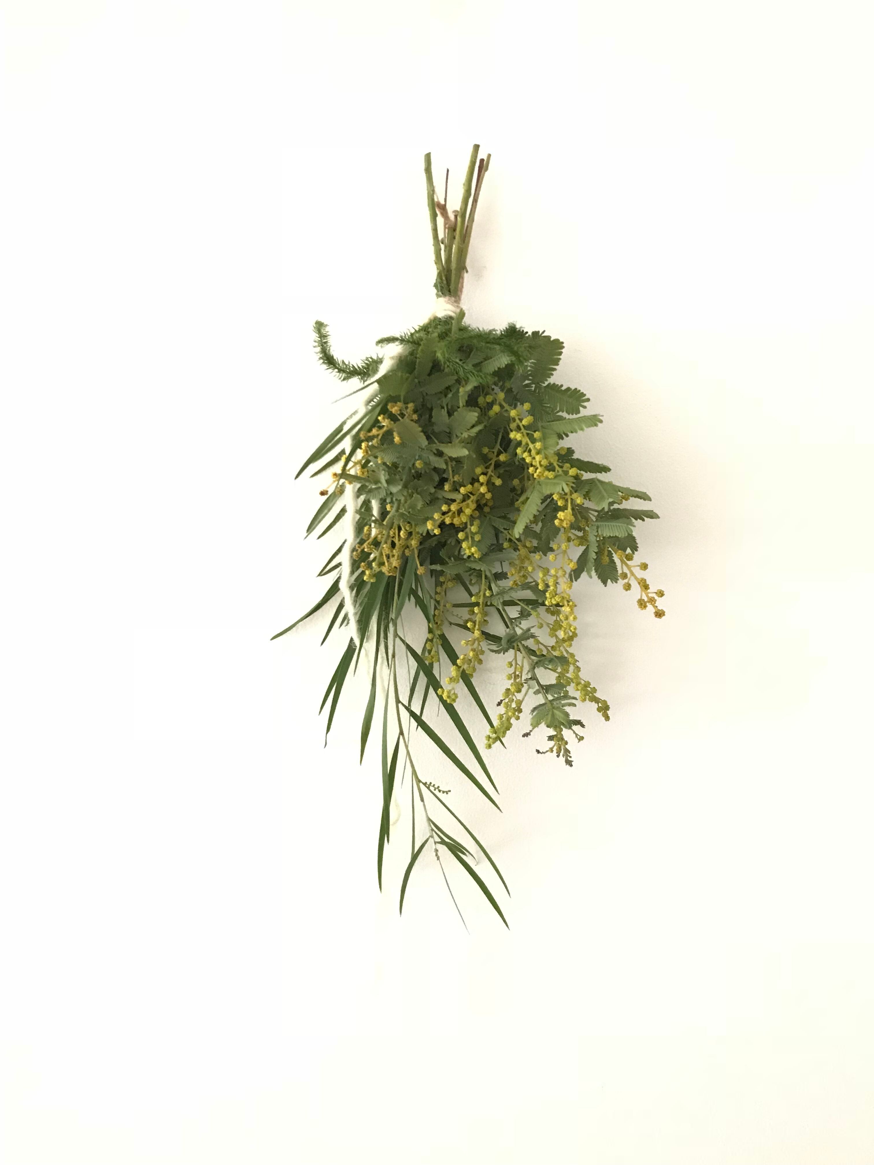 ・ミモザ(銀葉アカシア、フロリバンダ)、ひかげ ・2種類のミモザを束ねたフレッシュスワッグ ・長さ 30cm ・ポルトガルのおばあちゃんが紡いだ毛糸付き(取り外し可能) ・フレッシュですので少しずつ乾燥し色が変わっていきます。ご了承ください。